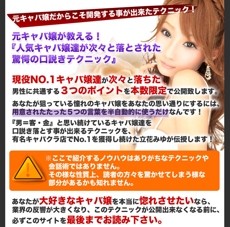 ▼▼▼こちらのサイトから「[セット版]元キャバ嬢が教える!『人気キャバ嬢達が次々と落とされた驚愕の口説きテクニック』+元キャバ嬢だから知っている!「冴えない男でも“たった1回”で狙った女とSEXまでいける5アクションデート術」」を申し込まれた方には豪華特典をプレゼント中!!!▼▼▼